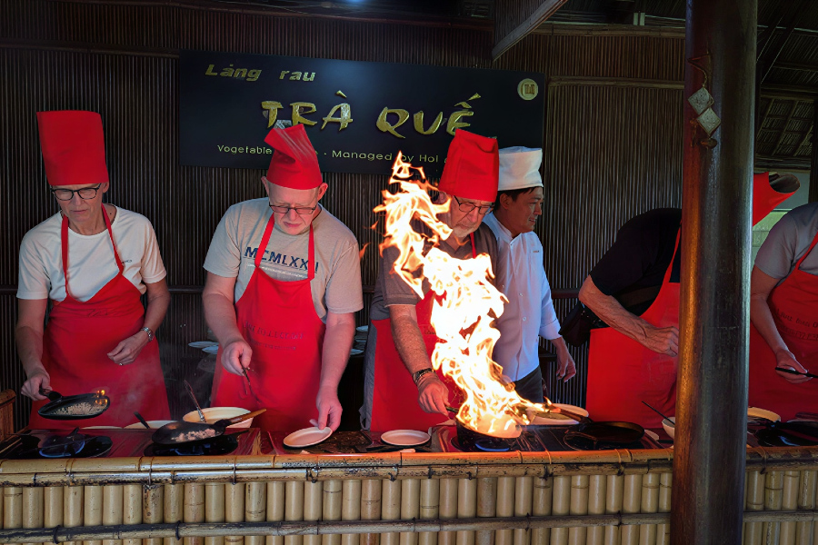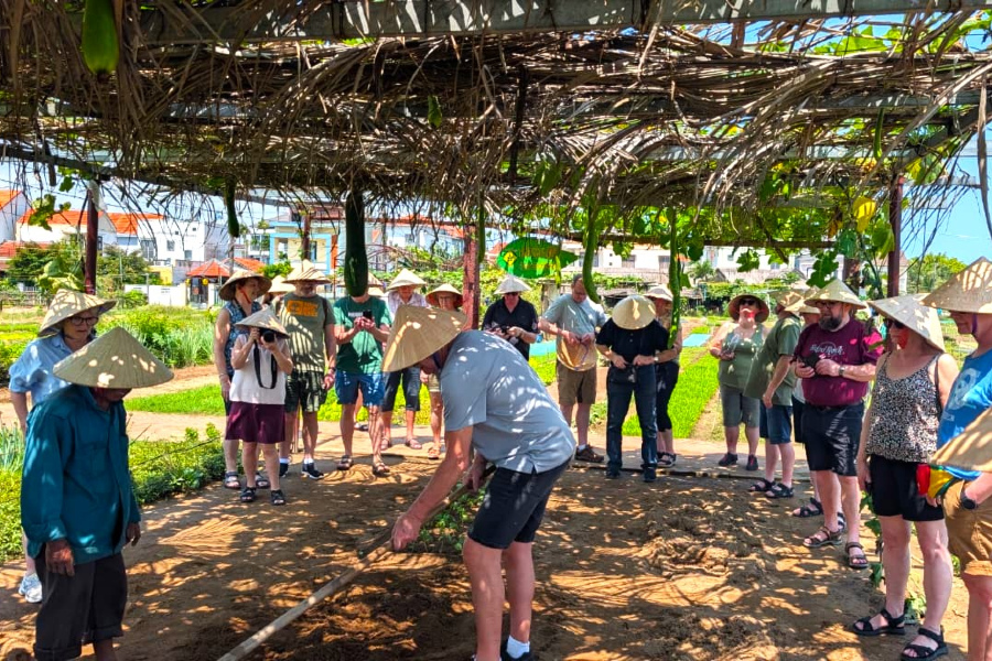 Vi cykler langs frodige rismarker og rejefarme til Tra Que, en kollektiv landsby, der udelukkende dyrker grøntsager og krydderurter. Vi ser deres flotte køkkenhaver, ser farmerne arbejde i marken med deres traditionelle metoder som for 100 år siden: Her er ingen elektriske maskiner i brug.